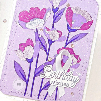 I used Lavender Glaze card stock and blended the design with Popsicle, Lollipop, Dried Fig & Jelly Donut inks along with a Cosmic Shimmer - Luna Paste - Moonlight Pink on some of the design. If you zoom in close you'll see the entire panel has a light sparkly mist which was added using a Deco Foil Glitter Dust Silver Spray. If you like shine, I highly recommend this spray!