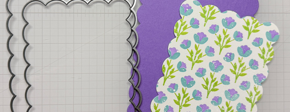 To help the bright burst of flowers pop I laid them on top of a scallop frame then positioned it all onto a Buttercream card base lightly stamped with Linen background stamp.