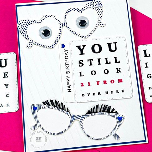 I added Wiggle Eyes and even made some flashy eyelashes for some added fun to these retro looking eyeglasses! And I have to admit, the "You Still Look 21 From Over Here" sentiment is my favorite from the Truly Spectacular stamp & die sentiment set. Anyone over 22 will appreciate that one 😉!